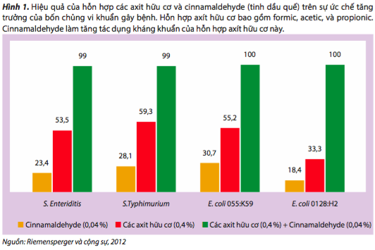 Phytogenics là những chất chuyển hóa thực vật có khả năng làm giảm sự tăng trưởng của vi khuẩn. Cơ chế hoạt động thay đổi tùy theo đặc điểm hóa học của chúng. Ví dụ, carvacrol và thymol chủ yếu được tìm thấy ở dầu oregano, làm thay đổi thành phần axit béo của các màng vi khuẩn và làm xáo trộn sự toàn vẹn của màng. Cinnamaldehyde, tìm thấy ở dầu của vỏ cây quế, làm suy yếu sự tăng sinh của vi khuẩn bằng cách ngăn chặn sự phân bổ vị trí phân chia. Vi khuẩn giãn dài ra và không phân chia được (Domadia và cộng sự, 2007). Các tính chất kháng khuẩn của các axit hữu cơ và phytogenic có thể cộng hưởng. Một sự kết hợp có hiểu biết và tính toán tạo ra hiệu quả lớn hơn trong việc làm giảm sự tăng trưởng của E. coli và Salmonella (Riemen- sperger và cộng sự, 2012) (Hình 1).