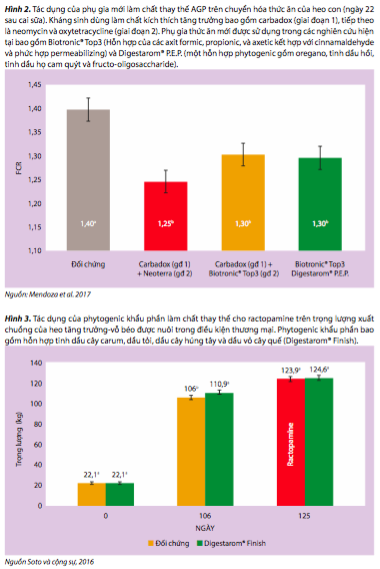 Các chất kích thích tăng trưởng kháng sinh (AGPs) trong lịch sử đã được sử dụng để tăng tốc độ tăng trưởng và hiệu quả thức ăn. Tại các thị trường như EU, Mỹ, kháng sinh được dùng làm chất kích thích (AGP) đã bị cấm. Cơ chế hoạt động của AGPs không được hiểu rõ hoàn toàn. Tuy nhiên, giả thuyết chiếm ưu thế nhất là sự điều biến khu hệ vi sinh vật và tác dụng chống viêm kích. Tác dụng của của sự bổ sung khẩu phần các hợp chất phytogenic kết hợp với axit hữu cơ trên năng suất của heo đã được đánh giá và so sánh với một chương trình AGP (Mendoza và cộng sự, 2017). Heo con giai đoạn dưỡng/nursery được cho ăn phytogenics và acid hữu cơ đã cho hiệu quả thức ăn tương tự so với heo được cho ăn AGP (Hình 2). Các hợp chất phytogenic cũng đã chứng minh là cải thiện sự tăng trưởng của heo tăng trưởng-vỗ béo. Soto và cộng sự, 2016 đã tường trình rằng heo tăng trưởng được cho ăn hỗn hợp các thành phần phytogenic đã cho trọng lượng xuất chuồng tương tự so với heo được cho ăn ractopamine (Hình 3).