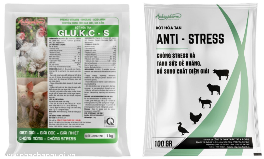 Để ngăn ngừa và đối phó tốt với tình trạng stress nhiệt thường xảy ra trong môi trường chăn nuôi hiện nay, Quý bà con chăn nuôi nên bổ sung thường xuyên một trong những sản phẩm vào khẩu phần thức ăn hàng ngày của gia súc, gia cầm như: ELECTROLYTE hoặc VITAMIN C hoặc GLU.K.C – S hoặc ANTI – STRESS.