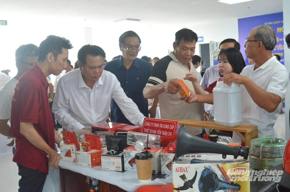 Các hộ dân và doanh nghiệp đầu tư nhà nuôi tìm hiểu về thiết bị dẫn dụ, phục vụ nghề nuôi chim yến. Ảnh: Trung Chánh.