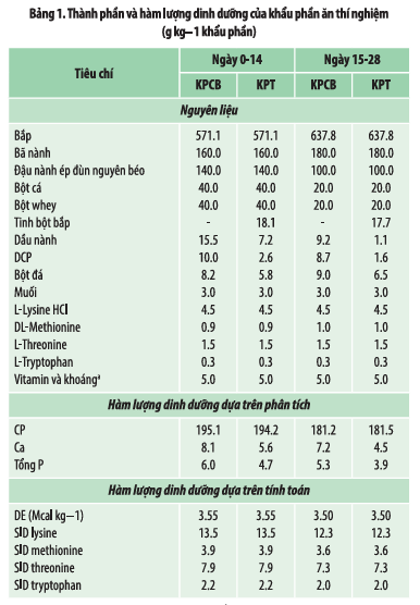 Không có sự khác biệt nào được quan sát thấy đối với mức tăng trọng trung bình hàng ngày (ADG), lượng thức ăn tiêu thụ trung bình hàng ngày (ADFI) hoặc tỷ lệ chuyển đổi thức ăn (FCR) giữa nhóm KPCB và nhóm KPT + 25D (Bảng 2). Tuy nhiên, so với KPT, KPT + 25-D đã cải thiện ADG đáng kể trong giai đoạn 2 và toàn bộ thời gian nghiên cứu.