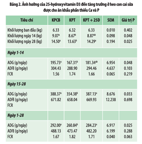 Liều lượng khuyến cáo và an toàn của 25OHD3 cho khẩu phần ăn của heo là 50 μg/kg và đây là liều lượng được chọn trong nghiên cứu này. Kết quả cho thấy, heo con ăn chế độ KPT có ADG thấp hơn đáng kể so với heo con ăn chế độ KPCB, điều này làm nổi bật tầm quan trọng của việc hấp thụ đủ Ca và P để đảm bảo tăng trưởng bình thường. Sự khác biệt không đáng kể về ADG giữa nhóm KPCB và nhóm KPT + 25D cho thấy 25OHD3 có thể làm giảm tác động tiêu cực của lượng Ca và P thấp đối với tăng trưởng của heo con.