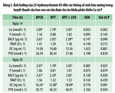 25OHD3 đóng vai trò quan trọng trong việc duy trì nồng độ Ca và P tối ưu cho sự phát triển của xương. Việc bổ sung 25OHD3 vào khẩu phần ăn thiếu Ca và P có thể cải thiện tình trạng dinh dưỡng của các khoáng chất này, từ đó thúc đẩy sự phát triển xương ở heo con. Các dấu ấn sinh học tái tạo xương, chẳng hạn như BALP và OC, tăng đáng kể ở nhóm KPT + 25D, cho thấy việc bổ sung 25OHD3 có khả năng bù đắp cho sự ức chế hình thành xương do thiếu Ca và P.