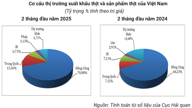 Trong 2 tháng đầu năm 2025, Việt Nam xuất khẩu thịt và các sản phẩm thịt tới 24 thị trường. Trong đó, Hồng Kông vẫn là thị trường xuất khẩu thịt và các sản phẩm thịt lớn nhất của Việt Nam, chiếm 57,6% về lượng và chiếm 70,08% về trị giá trong tổng xuất khẩu thịt và các sản phẩm thịt của cả nước, đạt 1,7 nghìn tấn, trị giá 12,43 triệu USD, tăng 3,2% về lượng, tăng 17% về trị giá so với cùng kỳ năm 2024.