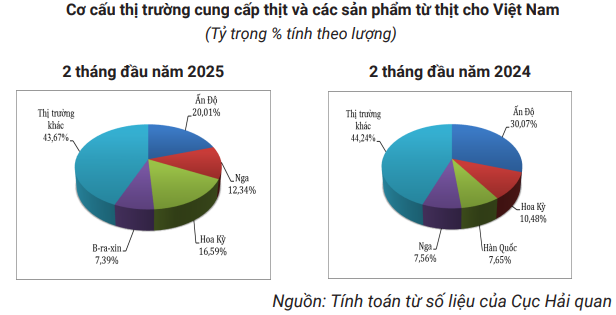 Trong 2 tháng đầu năm 2025, Ấn Độ vẫn là thị trường cung cấp thịt và các sản phẩm từ thịt lớn nhất cho Việt Nam, chiếm 20% trong tổng lượng nhập khẩu của cả nước, đạt 28,07 nghìn tấn, trị giá 95,45 triệu USD, giảm 19,6% về lượng và giảm 10,2% về trị giá so với 02 tháng đầu năm 2024.