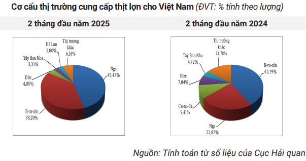 Trong 2 tháng đầu năm 2025, Việt Nam nhập khẩu thịt lợn từ 16 thị trường trên thế giới, trong đó Nga – thị trường lớn nhất, chiếm 45,47% tổng lượng thịt lợn nhập khẩu của cả nước; Brasil chiếm 38,2%; Đức chiếm 4,05%; Tây Ban Nha chiếm 3,31%; Hà Lan chiếm 2,8%; Hoa Kỳ chiếm 1,2%; Canada chiếm 1,05%; các thị trường khác chiếm 3,92%.