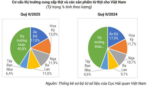 Trong quý II/2025, Ấn Độ, Nga, Hoa Kỳ, Úc, Brasil, Canada, Ba Lan, là những thị trường lớn nhất (tính theo trị giá) cung cấp thịt và sản phẩm từ thịt cho Việt Nam. Trong đó, nhập khẩu thịt và các sản phẩm từ thịt từ thị trường Úc, Canada, Ba Lan tăng mạnh.