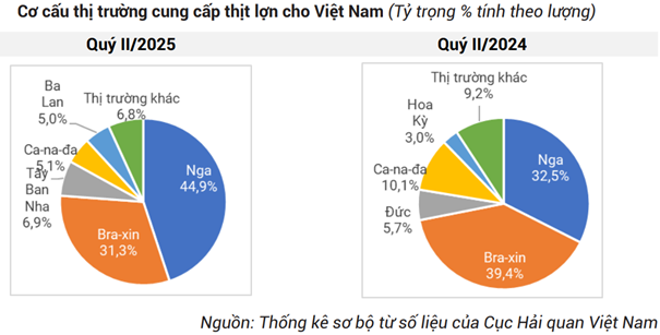 Trong quý II/2025, Việt Nam nhập khẩu 34,5 nghìn tấn thịt lợn, trị giá 92,33 triệu USD, giảm 0,3% về lượng, nhưng tăng 0,5% về trị giá so với quý I/2025; Còn so với quý II/2024 tăng 26,5% về lượng và tăng 50,3% về trị giá. Nga, Brasil, Tây Ban Nha, Canada, Ba Lan là 5 thị trường lớn nhất cung cấp thịt lợn cho Việt Nam trong quý II/2025. Trong đó, Nga là thị trường lớn nhất cung cấp thịt lợn cho Việt Nam với 15,5 nghìn tấn, trị giá 46,83 triệu USD, giảm 10,3% về lượng và giảm 7,6% về trị giá so với quý I/2025, nhưng so với quý II/2024 tăng 74,9% về lượng và tăng 124,2% về trị giá.