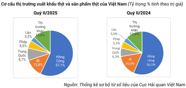 Việt Nam xuất khẩu thịt và sản phẩm thịt chủ yếu sang các thị trường thuộc khu vực châu Á, trong đó xuất khẩu sang thị trường Hồng Kông chiếm 39,91% về lượng và chiếm 57,07% về trị giá, đạt 2,5 nghìn tấn, trị giá 17,16 triệu USD, giảm 14,5% về lượng và giảm 12,9% về trị giá so với quý I/2025; So với quý II/2024 giảm 2,5% về lượng, tăng 17,2% về trị giá.