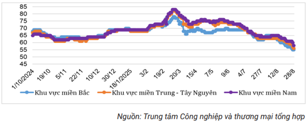 Giá lợn hơi tại khu vực miền Nam dao động trong khoảng 58.000 – 65.000 đồng/kg, những ngày đầu tháng 8/2025 giá lợn hơi giảm từ 3.000 – 7.000 đồng/kg, sau đó giảm 2.000 – 4.000 đồng/kg, những ngày cuối tháng giảm từ 3.000 – 6.000 đồng/kg so với những ngày cuối tháng 7/2025.