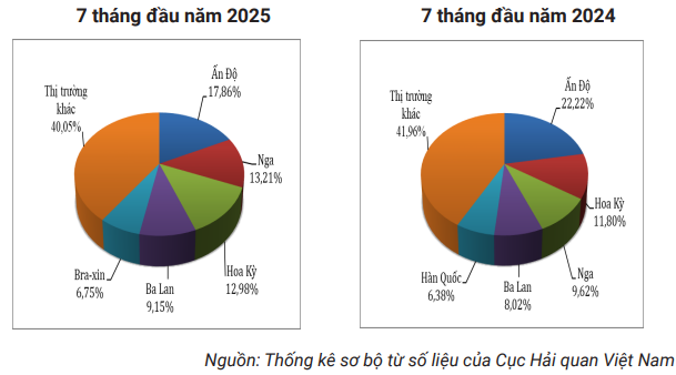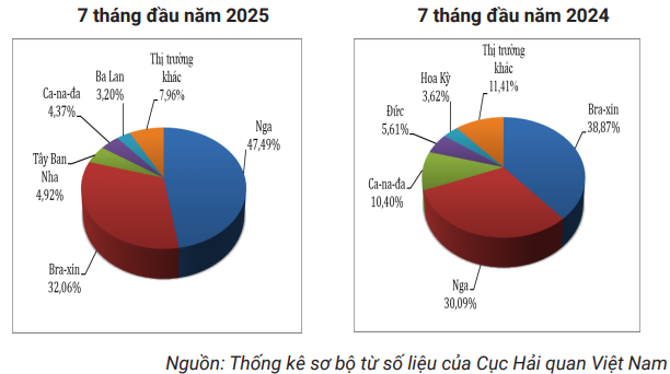 Trong 7 tháng đầu năm 2025, Việt Nam nhập khẩu thịt lợn từ 21 thị trường. Trong đó, Nga tiếp tục là thị trường cung cấp thịt lợn lớn nhất cho Việt Nam, chiếm 47,49% tổng lượng thịt lợn nhập khẩu của cả nước; Tiếp theo là Brasil chiếm 32,06%; Tây Ban Nha chiếm 4,92%; Canada chiếm 4,37%; Ba Lan chiếm 3,2%; các thị trường khác chiếm 7,96%.