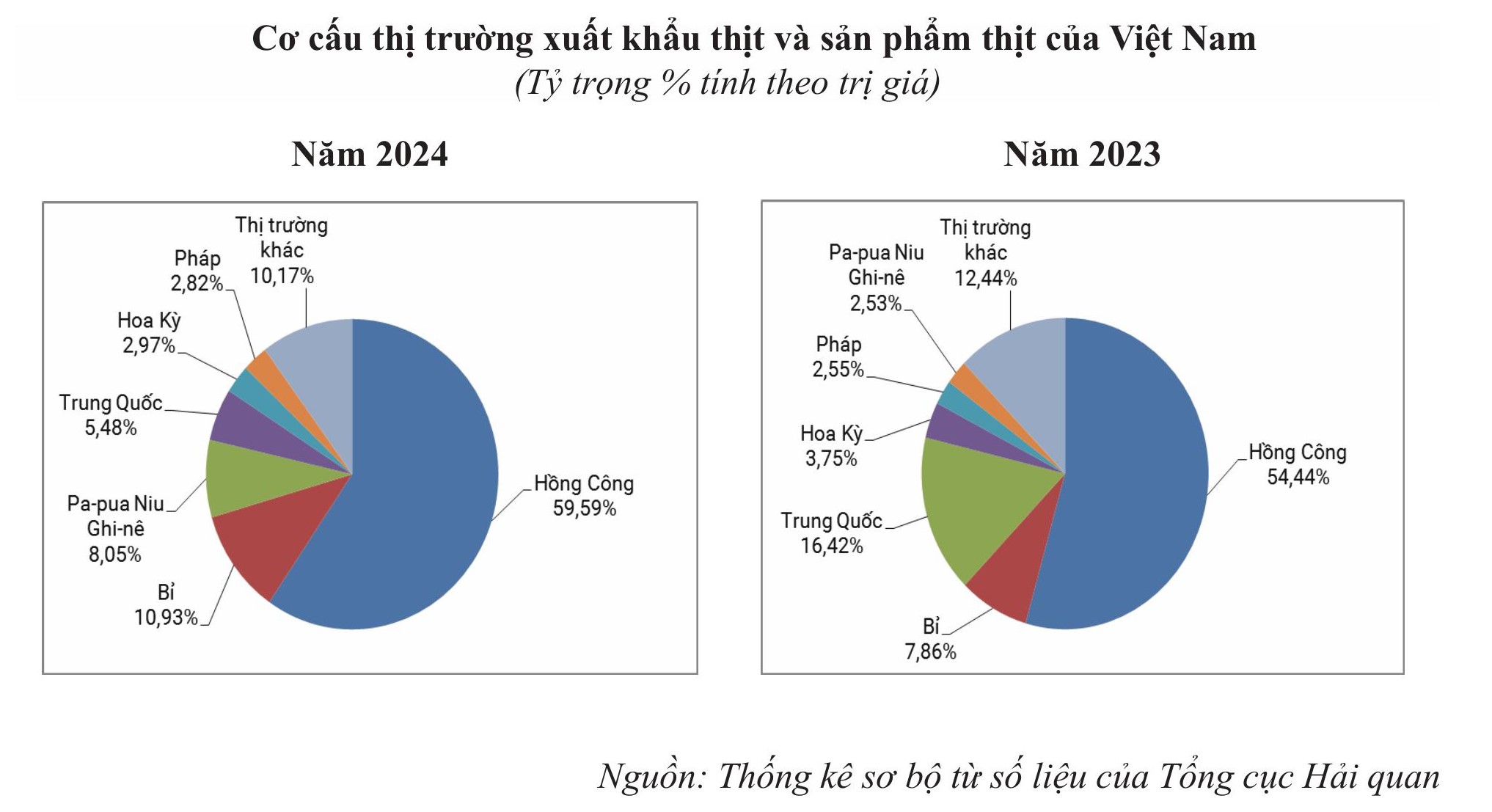 Trong năm 2024, thịt và các sản phẩm thịt của Việt Nam được xuất khẩu tới 37 thị trường, trong đó Hồng Công vẫn là thị trường xuất khẩu thịt và các sản phẩm thịt lớn nhất của Việt Nam, chiếm 50,65% về lượng và chiếm 59,59% về trị giá trong tổng xuất khẩu thịt và các sản phẩm thịt của cả nước, với lượng đạt xấp xỉ 12,3 nghìn tấn, trị giá 69,73 triệu USD, tăng 27,6% về lượng và tăng 16,1% về trị giá so với năm 2023.