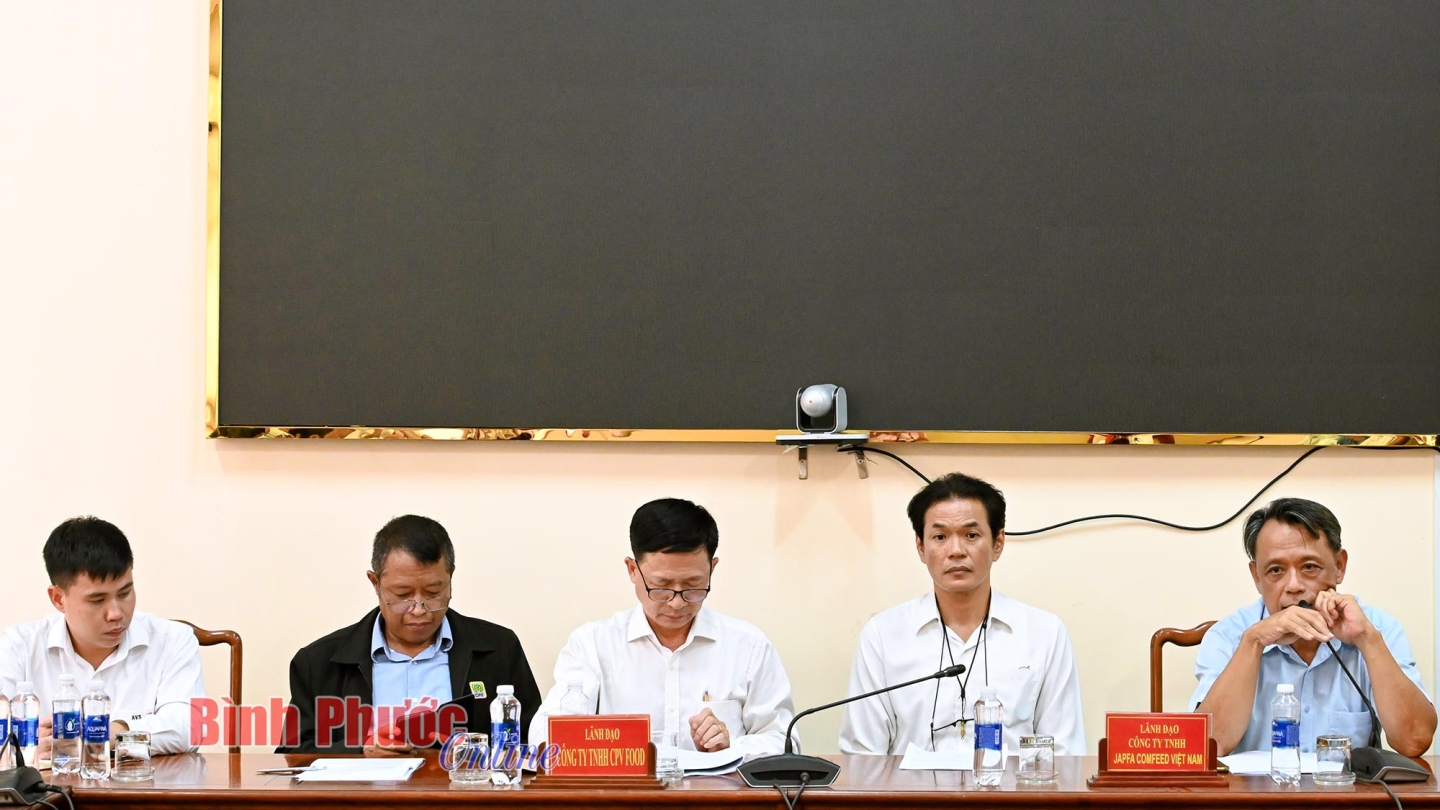 Trước buổi làm việc, đoàn công tác đã đến thăm, làm việc trực tiếp với Công ty TNHH CPV Food Bình Phước. Đây là một trong những dự án đầu tư về thực phẩm hiện đại và lớn nhất ở Việt Nam, hoạt động theo chuỗi cung ứng khép kín từ thức ăn chăn nuôi, trang trại đến nhà máy chế biến thực phẩm.