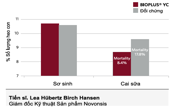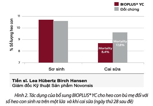 Một nghiên cứu khác cũng đề cập đến tác dụng của BIOPLUS® YC bổ sung vào thức ăn tập ăn đã chỉ ra rằng tỷ lệ chết trước cai sữa có thể giảm đáng kể hơn 50% nhờ bổ sung men vi sinh (Hình 2). Sự gia tăng đáng kể tỷ lệ sống sót của heo con dẫn đến việc mỗi nái có thêm một heo con cai sữa mỗi năm, đây là một dấu hiệu rõ ràng cho thấy men vi sinh có thể cải thiện hiệu suất và lợi nhuận của các đàn nái.