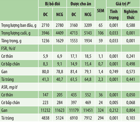Bảng 1. Tốc độ tăng trưởng và tỷ lệ tổng hợp protein của heo con trong tình trạng bị bỏ đói hoặc được cho ăn trước khi bổ sung NCG