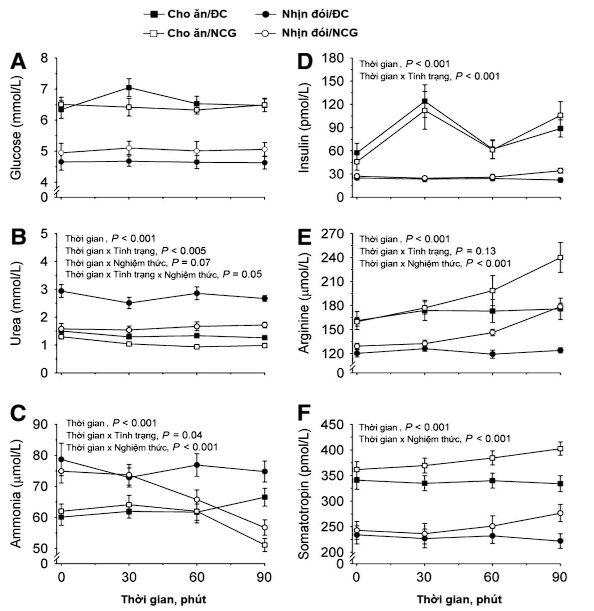 Phân tích axit amin và các thành phần khác trong huyết tương được thực hiện bằng các phương pháp chuẩn. Phân tích thống kê được thực hiện theo mô hình tuyến tính chung của SAS để kiểm tra các tác động chính và tương tác giữa tình trạng trước khi cho ăn (Nhịn đói vs Được cho ăn) và nghiệm thức (Đối chứng vs NCG). Sự khác biệt có ý nghĩa thống kê được xác định khi giá trị p < 0,05.