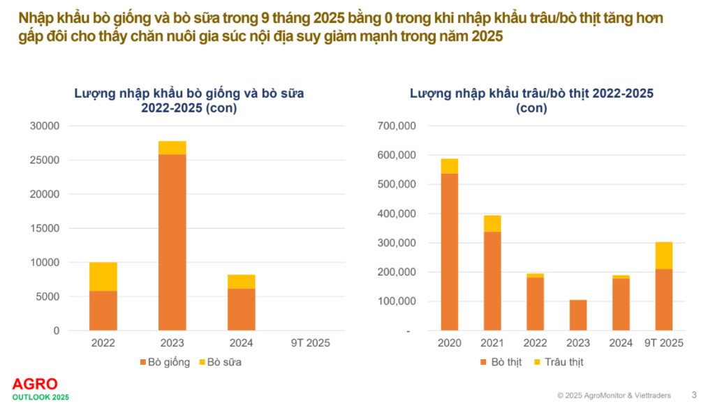 Đối với chăn nuôi bò: Nhập khẩu bò giống, bò sữa giảm rất mạnh trong khi nhập khẩu bò sống tăng mạnh cho thấy chăn nuôi bò sữa/bò thịt nội địa gặp nhiều khó khăn. Cụ thể, 9 tháng đầu năm 2025, Việt Nam không nhập khẩu bò giống và bó sữa. Trong khi đó, lượng nhập khẩu bò thịt, trâu thịt đạt gần 300.000 con. Nhu cầu tiêu thụ nội địa phục hồi nhưng nhập khẩu trâu, bò sống tăng mạnh khiến cho chăn nuôi bò nội địa thu hẹp. Giá bò Thái Lan giảm cùng khó khăn từ hoạt động xuất khẩu đi Campuchia khiến lượng bò Thái xuất sang Việt Nam tăng mạnh trong năm 2025 trong khi bò Úc giảm. Nhập khẩu sữa tăng mạnh, có thể đạt mức cao nhất trước tới nay, đe dọa ngành chăn nuôi bò sữa nội địa.