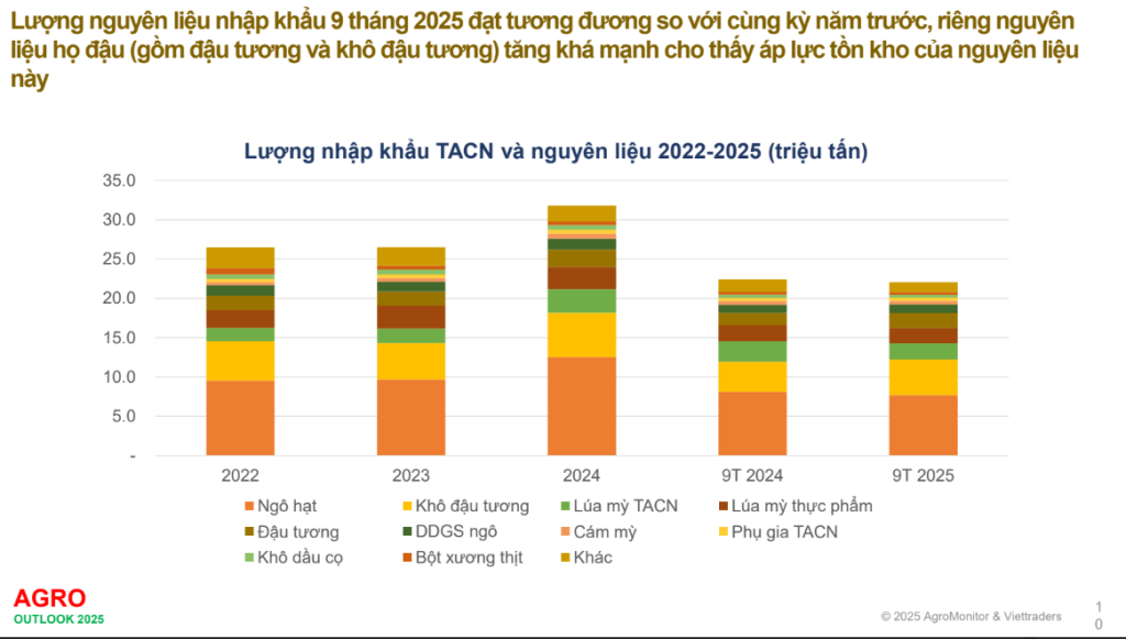 Chính vì vậy, sự gia tăng trong tiêu thụ cám gia cầm bù đắp hầu như hoàn toàn sự sụt giảm tronng tiêu thụ cám gia súc nên tổng cầu tiêu thụ cám nội địa trong năm 2025 chỉ giảm nhẹ 2% so với năm 2024. CHính vì vậy, lượng nguyên liệu nhập khẩu 9 tháng đầu năm 2025 đạt tương đương với cùng kỳ năm trước, riêng nguyên liệu họ đậu (đậu tương và khô đậu tương) tăng khá mạnh cho thấy áp lực tồn kho của nguyên liệu này.