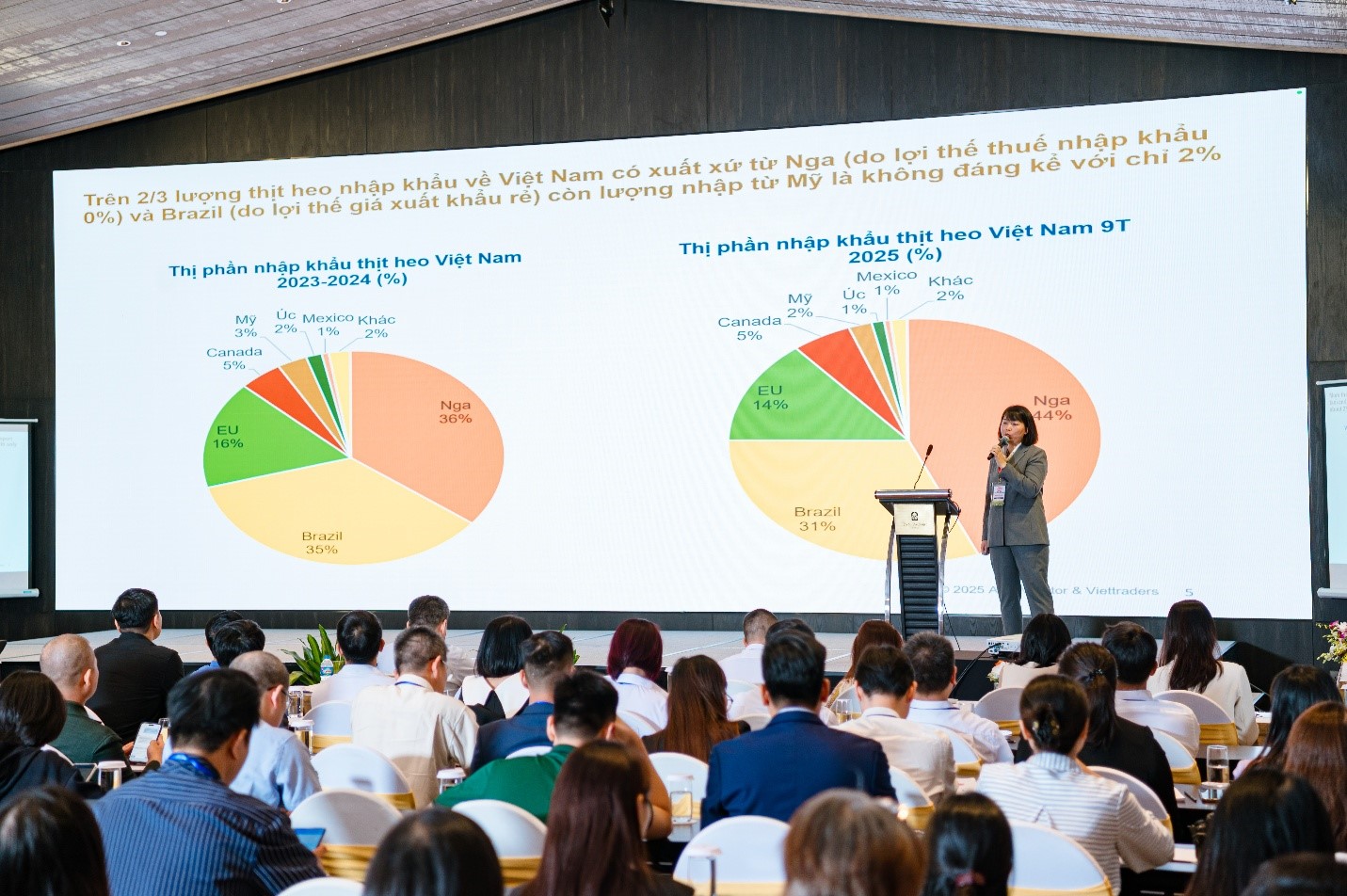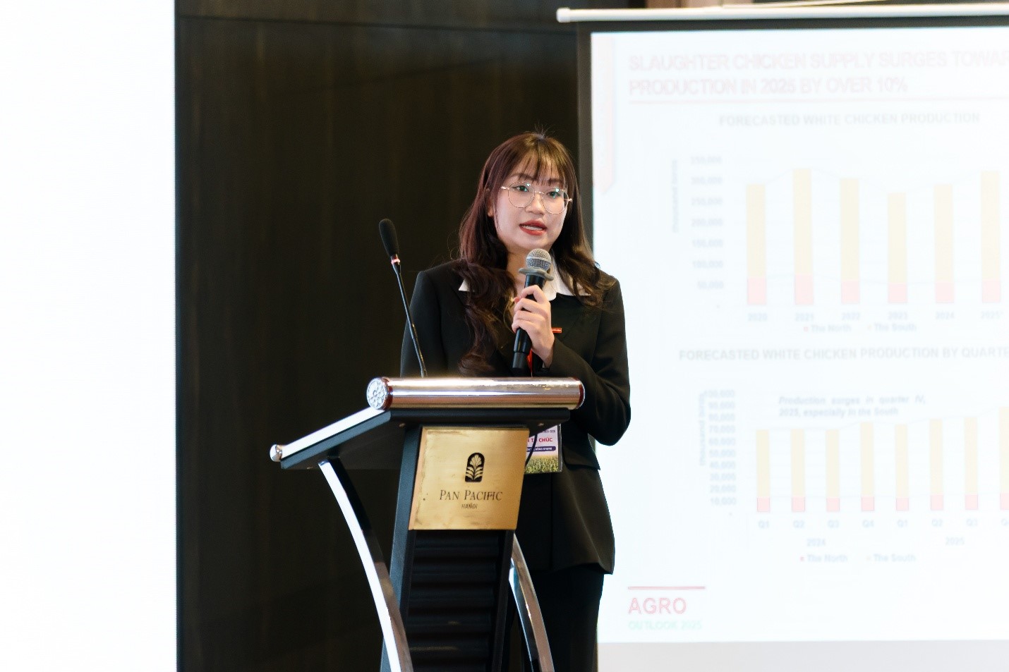 Tại sư kiện, bà Trần Ngọc Yến, Giám đốc Phân tích nhóm thức ăn chăn nuôi & chăn nuôi cho biết, tại hội thảo vào tháng 6/2025 được tổ chức tại TP. Hồ Chí Minh, công ty đã có cập nhật thị trường và đưa ra dự phóng cho năm 2026, nhưng câu chuyện quý II và III có nhiều thay đổi. Đó là các sản phẩm chăn nuôi của Việt Nam có nhiều cơ hội xuất khẩu đi Campuchia; từ 1/7/2025 có những chính sách liên quan tới VAT và nhập khẩu; tình hình thiên tai có nhiều diễn biến phức tạp. Vì vậy, tổ chức sự kiện vào tháng 10 sẽ giúp chúng ta nhìn rõ hơn bức tranh của năm 2025 và đưa ra những kịch bản phóng tác cho năm 2026.