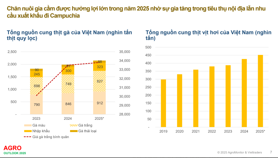 Ngược lại với ngành gia súc, chăn nuôi gia cầm của Việt Nam, đặc biệt là gà trắng tiếp tục tăng trưởng mạnh trong năm 2025 do giá gà cao trong năm 2024. Tuy nhiên, thị trường có dấu hiệu dư cung khi tăng trưởng nhanh hơn so với tiêu thụ, kéo giá giảm mạnh trong tháng 5 và 6. Mặc dù vậy, cơ hội từ việc xuất khẩu gà giống, gà sống đi Campuchia đã giúp thị trường cân bằng, đẩy giá gà tăng mạnh, mang lại lợi nhuận tốt cho công ty chăn nuôi.