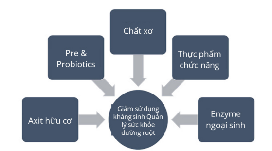 Nhiều chất phụ gia thức ăn hỗ trợ sức khỏe đường ruột, bao gồm axit hữu cơ, men vi sinh, prebiotic, chất phytochemical/tinh dầu, v.v., được sử dụng kết hợp hoặc riêng lẻ, đã được nghiên cứu như một giải pháp thay thế cho thuốc kháng sinh trong chăn nuôi. Có sự khác biệt về tác động của các chiến lược giữa và trong cùng một loài; điều này cho thấy không có giải pháp “phù hợp cho tất cả”.