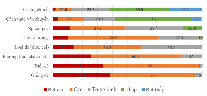 lớn (rất cao và cao) đến chất lượng sản phẩm. Bên cạnh đó, hơn 50% chủ nhà hàng cho rằng giới tính, khối lượng giết mổ và nguồn gốc dê cũng ảnh hưởng đáng kể đến chất lượng thịt. Rất ít chủ nhà hàng tin rằng phương pháp giết mổ và vận chuyển ảnh hưởng đáng kể đến chất lượng thịt dê.