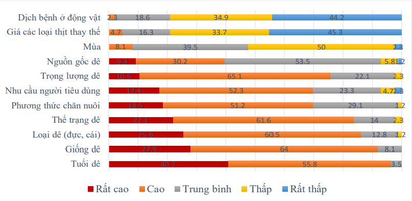 Đánh giá quan điểm của chủ nhà hàng về 11 yếu tố ảnh hưởng đến giá dê (Hình 4) cho thấy bảy yếu tố chính có ảnh hưởng rất lớn (từ rất cao và cao) đến giá thị trường thịt dê đó là tuổi; giống; giới tính; thể trạng; khối lượng; phương thức chăn nuôi và nhu cầu khách hàng. Hầu hết những yếu tố này liên quan/xuất phát trực tiếp từ người chăn nuôi. Từ kết quả này cho thấy, người chăn nuôi dê là mắt xích quan trọng nhất để nâng cao giá trị của dê thịt nhằm đáp ứng nhu cầu thị trường.
