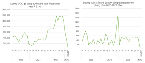 Hình 1. Xuất khẩu DOC và gà trắng thịt kênh chính ngạch lẫn tiểu ngạch đều giảm mạnh trong quý I/2026