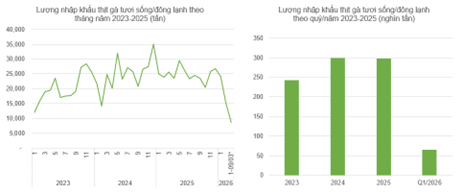 Hình 2. Nhập khẩu thịt gà có xu hướng giảm, đặc biệt từ quý II/2026 do ảnh hưởng của giá gà nội địa giảm sâu cùng cước container tăng mạnh theo giá dầu và sự gia tăng của tỷ giá