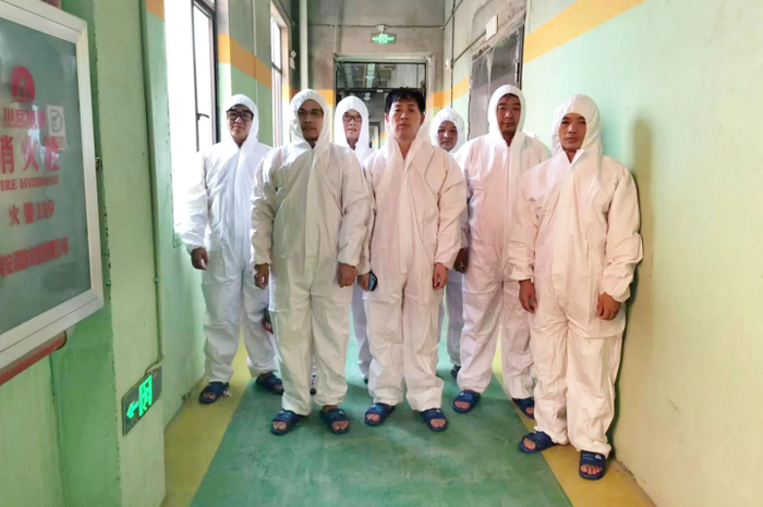 Khi đến thăm tổ hợp chăn nuôi của Hubei Zhongxin Kaiwei, khách thăm quan phải tắm rửa, khử trùng và sau đó lau khô người trước khi mặc bộ đồ bảo hộ toàn thân để ngăn ngừa sự lây lan của dịch bệnh nhưng không gì đảm bảo quy trình này sẽ luôn hoạt động. (Ảnh: New York Times)