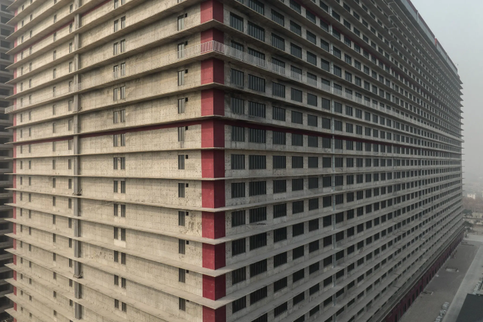 Cận cảnh tổ hợp chăn nuôi Hubei Zhongxin Kaiwei có 24 tầng dành riêng cho chăn nuôi lợn. Mỗi tầng hoạt động độc lập cho mọi giai đoạn trong tuổi đời của lợn, từ giao phối đến trưởng thành. (Ảnh: New York Times)