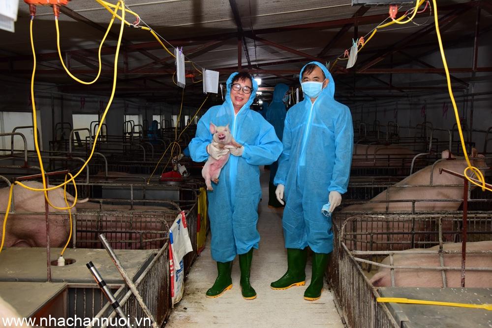 TS. Nguyễn Thị Hương (bên trái) tại trang trại lợn của Công ty Cổ phần AVAC Việt Nam