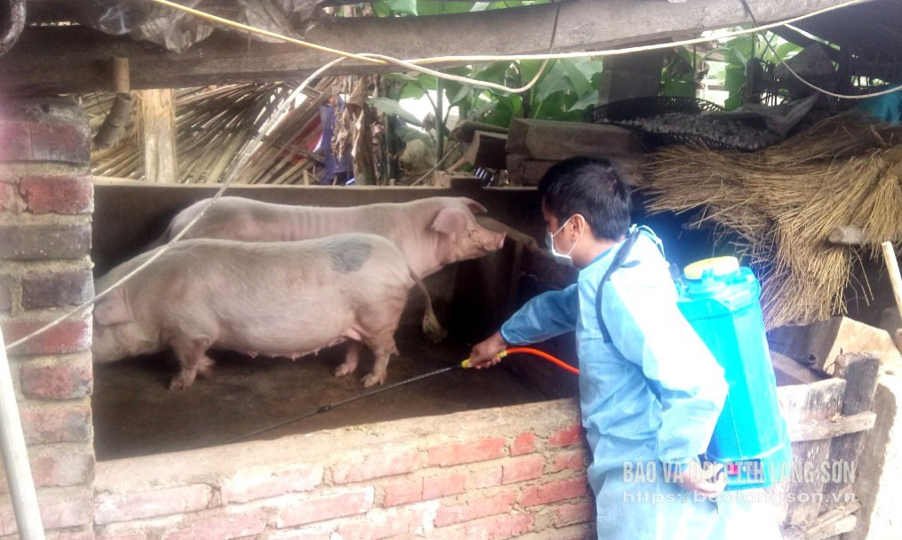 Cán bộ thú y của huyện Lộc Bình phun tiêu độc khử trùng khu vực chuồng trại chăn nuôi lợn