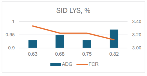 Nhiều nghiên cứu quốc tế đã củng cố tầm quan trọng của lysine trong năng suất heo. Goethals và cộng sự (2025) chứng minh rằng mức SID lysine cao hơn giúp heo sau cai sữa đạt tăng trọng trung bình ngày tốt hơn và FCR tối ưu hơn. Tương tự, Cordoba và cộng sự (2024) chỉ ra rằng trong 28 ngày cuối ở giai đoạn xuất thịt từ 103 đến 130 kg, việc tăng SID lysine giúp heo tăng ADG đáng kể đồng thời giảm FCR với ý nghĩa thống kê rõ rệt (Hình 2). Điều này cho thấy khẩu phần dinh dưỡng ở giai đoạn cuối – vốn quyết định hiệu quả kinh tế – phải được điều chỉnh linh hoạt để phù hợp với sinh lý tăng trưởng của heo.