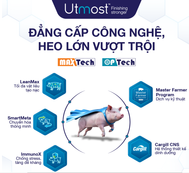 Trọng tâm của Utmost™ là ba công nghệ lõi gồm LeanMax, SmartMeta, ImmunoX, được thiết kế trên nền tảng hệ thống dinh dưỡng Cargill (Cargill CNS), kết hợp với chương trình dịch vụ kỹ thuật Master Farmer Program (Hình 1), trong đó mỗi công nghệ tác động lên một khía cạnh khác nhau trong quá trình sinh trưởng của heo thịt. Sự kết hợp đồng bộ này hướng tới mục tiêu tối đa tốc độ tăng cơ nạc, kiểm soát tích mỡ, giảm stress oxy hóa và nâng cao sức đề kháng, đồng thời tối ưu hóa hiệu quả sử dụng thức ăn.