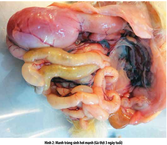 Mổ khám gà 9 ngày tuổi cho thấy: gan, thận sưng và xung huyết, niêm mạc ruột xung huyết, viêm ruột cata, thành ruột mỏng và đầy hơi; quan sát thấy những con gà chết trong dạ dày và ruột có chứa thức ăn chưa tiêu hết. Tỷ lệ chết là 1%.