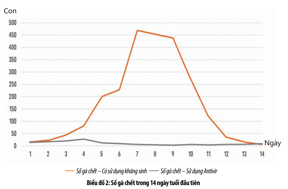 Vào cuối thời gian điều trị, kể từ ngày thứ 4 sử dụng Antivir, số gà chết giảm đáng kể (số liệu chi tiết về số gà chết được thể hiện trong biểu đồ 1).