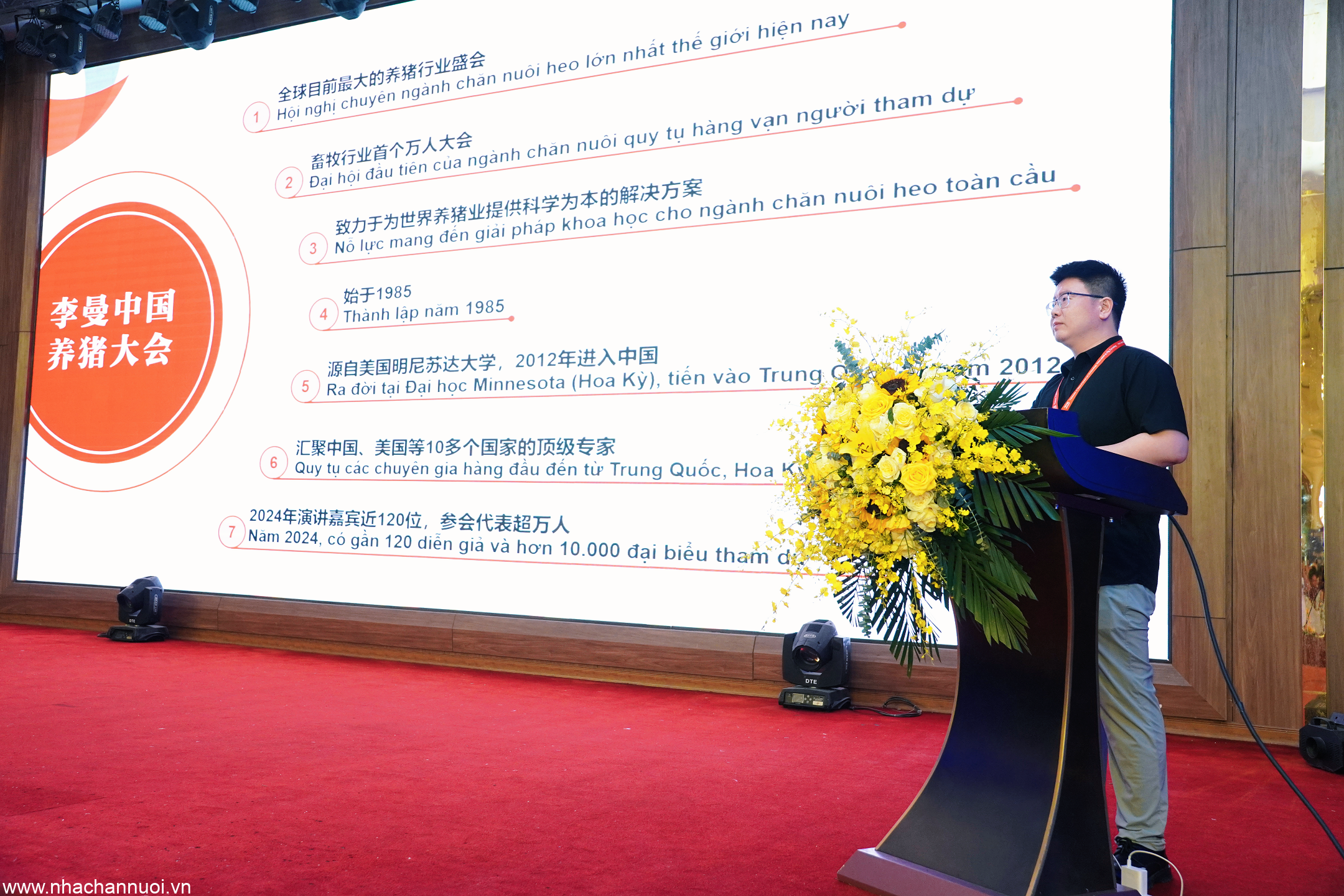 Ông Allan Liu, Giám đốc Kinh doanh và Chuyên gia hoạch định chăn nuôi heo cao cấp trình bày về chủ đề “Từ ứng phó khẩn cấp đến kiểm soát bền vững: Lộ trình kỹ thuật và bài học thực tiễn trong phòng chống dịch tả lợn châu Phi ở Trung Quốc”