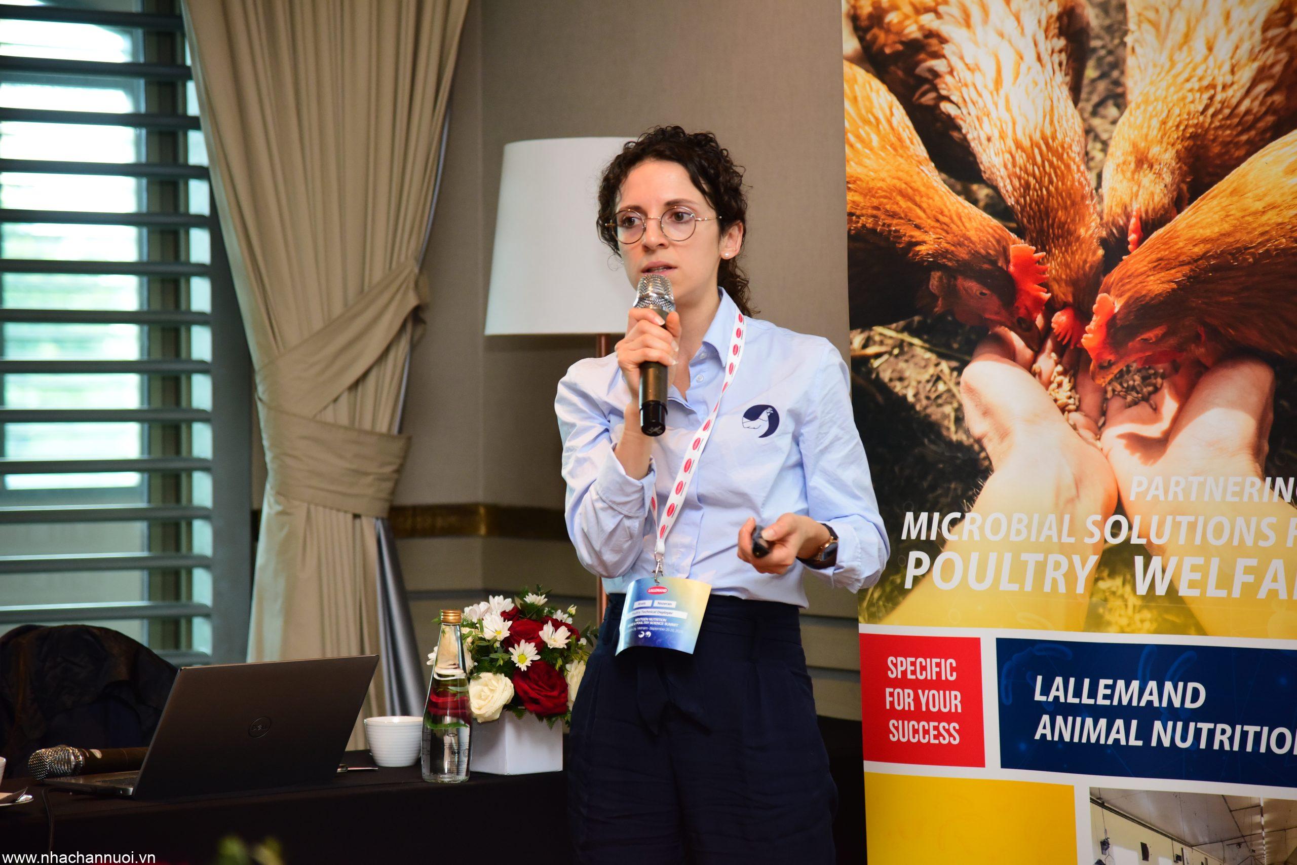 “Effixience: Men vi sinh thế hệ mới cho năng suất & sức khỏe đường ruột gà thịt” là tên bài trình bày của bà Anaïs Nozeran, Lallemand Animal Nutrition đã giới thiệu Effixience. Đây một chủng vi khuẩn Bacillus pumilus được chọn lọc nhờ khả năng sản xuất enzyme (lipase, protease) và khả năng kháng lại quá trình ép viên ở nhiệt độ cao. Giúp giảm hệ số chuyển đổi thức ăn, tăng cường hiệu quả tiêu hóa và kích thích sản xuất chất nhầy cải thiện khả năng bảo vệ hàng rào biểu mô.