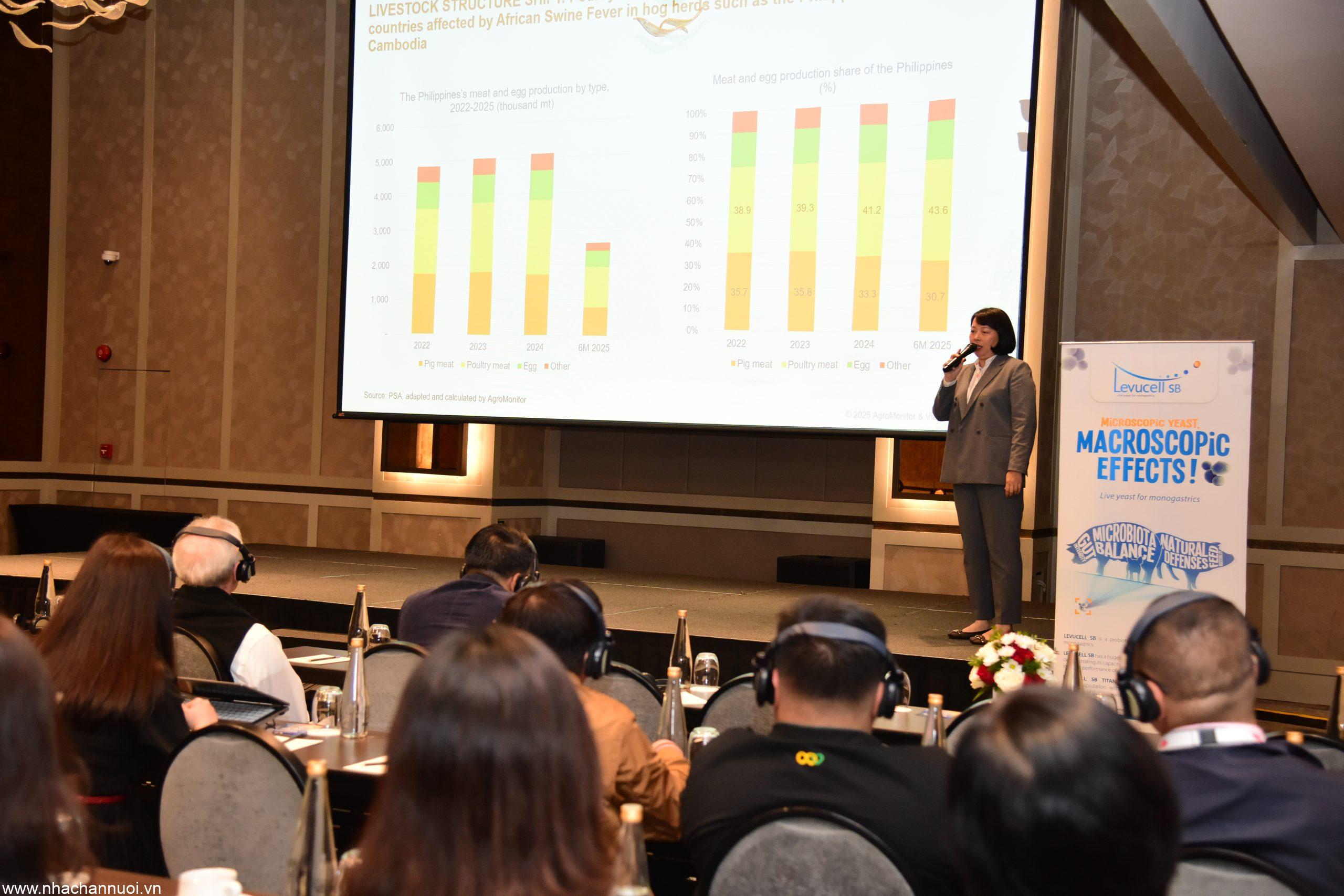 Bà Trần Ngọc Yến, Giám đốc Công ty Agromonitor, cung cấp cái nhìn sâu sắc về thị trường. Bà cho biết, sự bùng phát của Dịch tả heo Châu Phi (ASF) đã làm thay đổi cơ cấu chăn nuôi và chi phối thị trường cám ở Đông Nam Á.