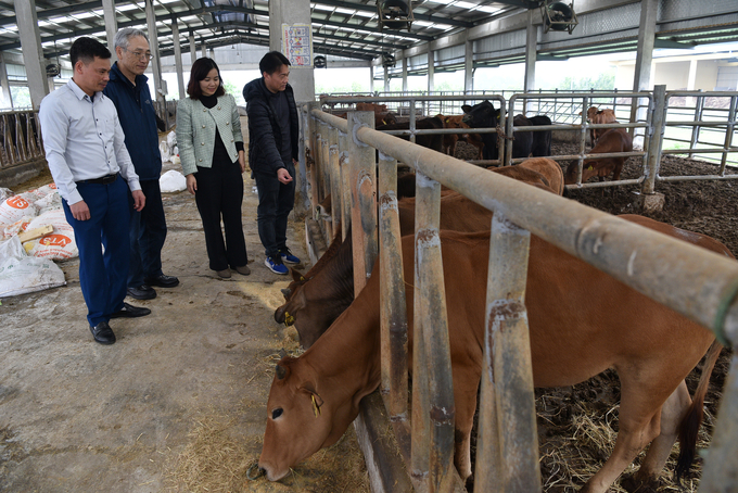 GS.TS. Takeshige Otoi (thứ hai từ trái) cùng các nhà khoa học Việt quan sát đàn bê vàng. Ảnh: Dương Đình Tường