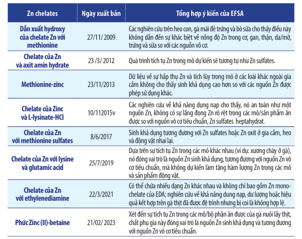 Bảng 1. Các Zn chelate và tóm tắt các ý kiến của EFSA về hiệu quả và khả dụng sinh học của chúng