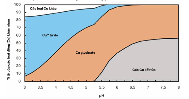 Các biểu đồ cũng chỉ ra sự phân ly đáng kể của các khoáng glycinate này ở độ pH dưới 4 đến 5. Khi khoáng glycinate xuất hiện trong đường ruột, chúng sẽ phân ly trong điều kiện pH axit, sau đó sẽ tái chelate hóa khi gặp điều kiện pH kiềm, dẫn đến có hơn 100% lượng khoáng vi lượng ban đầu được thêm vào dưới dạng khoáng glycinate có trong thức ăn. Tương tự, Byrne và cộng sự (2021) đã chỉ ra rằng, khoáng proteinate bị phân ly ngay khi độ pH giảm xuống dưới 6,5 với chưa đến 50% Cu-proteinate ở dạng chelate ở pH < 3,5.