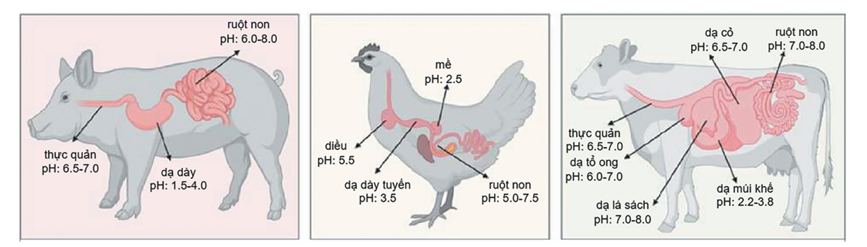 Hình 1. pH tại các vị trí khác nhau trong cơ quan tiêu hóa của heo, gà và thú nhai lạ