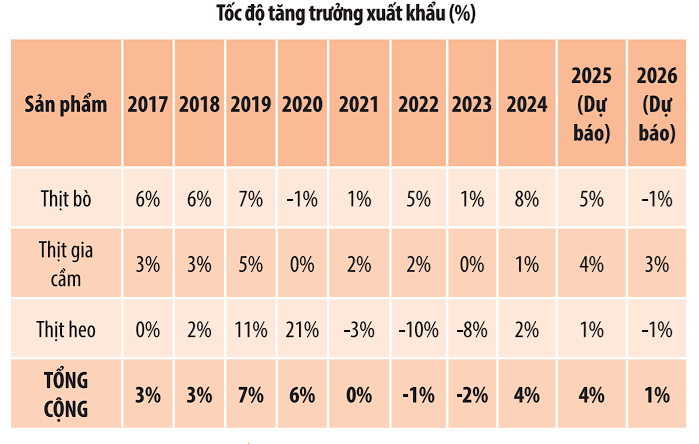 Sau giai đoạn phục hồi trong năm 2025, xuất khẩu thịt bò và thịt heo của các quốc gia thương mại lớn được dự báo sẽ giảm trong năm 2026, trong khi thương mại thịt gà tiếp tục duy trì đà tăng và có thể xác lập mức kỷ lục mới, trở thành điểm sáng hiếm hoi của thị trường thịt toàn cầu.