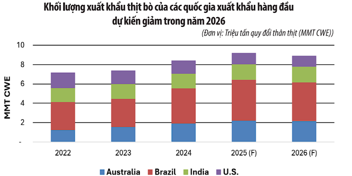 Về thương mại, xuất khẩu thịt bò toàn cầu năm 2026 dự báo đạt khoảng 13,5 triệu tấn, giảm 1,2% so với năm 2025 do nguồn cung xuất khẩu thu hẹp. Cơ cấu các quốc gia xuất khẩu lớn nhìn chung không thay đổi: