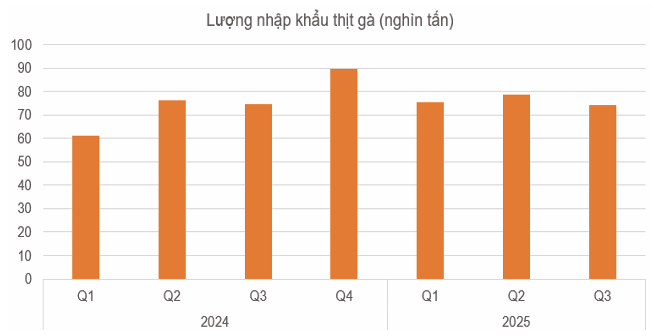 Tỷ giá và giá thịt gà tại các nước xuất khẩu tăng, cùng với việc giá gà nội địa sụt mạnh vào cuối quý II, khiến lượng nhập khẩu thịt gà về Việt Nam trong quý III giảm, bất chấp việc thuế nhập khẩu được điều chỉnh giảm. Tính chung 9 tháng năm 2025, lượng thịt gà nhập khẩu tăng 8% so với cùng kỳ năm trước.
