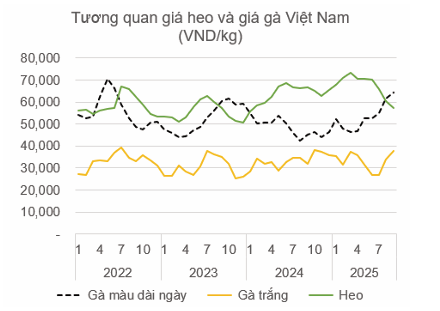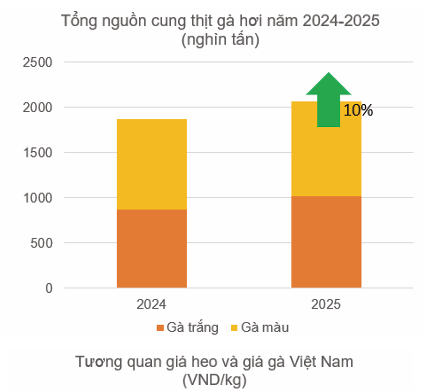 Giá gà màu tăng mạnh trong quý II và quý III mang lại lợi nhuận tốt cho người nuôi và công ty chăn nuôi, thúc đẩy việc tái đàn. Tính chung quý III/2025, giá gà màu tăng gần 20% so với quý trước đó và gần 30% so với cùng kỳ năm trước, đưa giá bình quân 9 tháng 2025 tăng gần 5%.