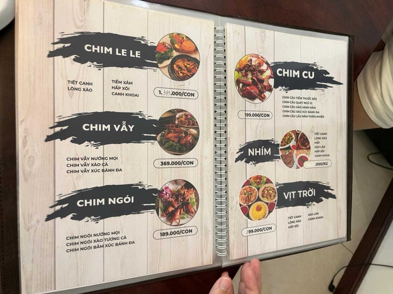 Thực đơn quảng cáo chim hoang dã tại một nhà hàng ở Hà Nội