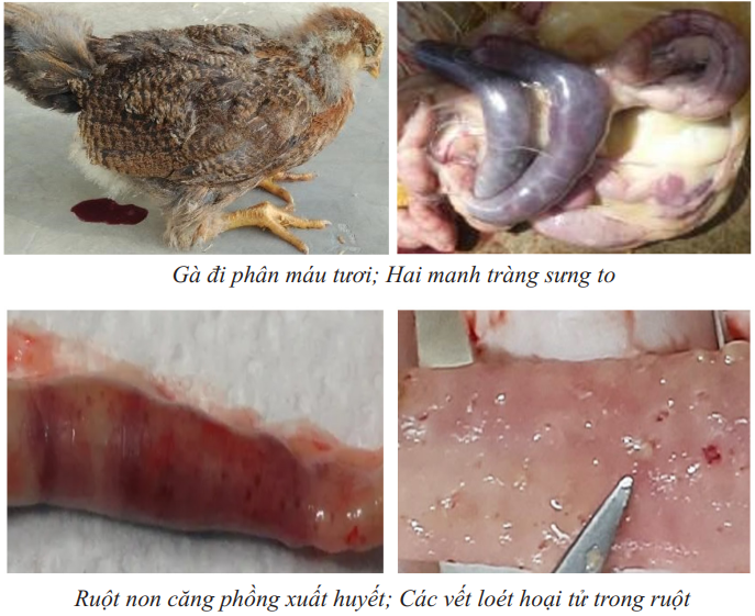 Manh tràng viêm xuất huyết phình to, chứa đầy chất nhầy có máu, trong có những cục máu nhỏ, xốp. Vách manh tràng mỏng đi, màng niêm mạc bị hủy hoại, phủ đầy những vết loét từ ngoài thấy rõ.